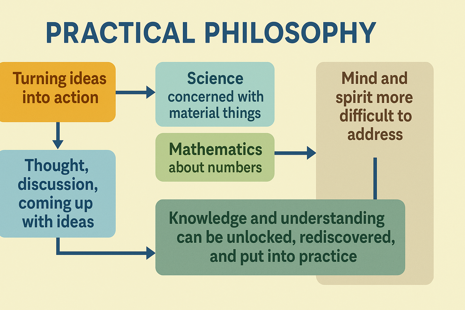 Practical philosophy is all about turning ideas into action. Philosophy itself is about thought, discussion and coming up with ideas. Science used to be called ‘natural philosophy’ concerning itself primarily with material things rather than ‘pure thought’ or perhaps ‘spiritual’ things while mathematics is the ‘philosophy’ of numbers.